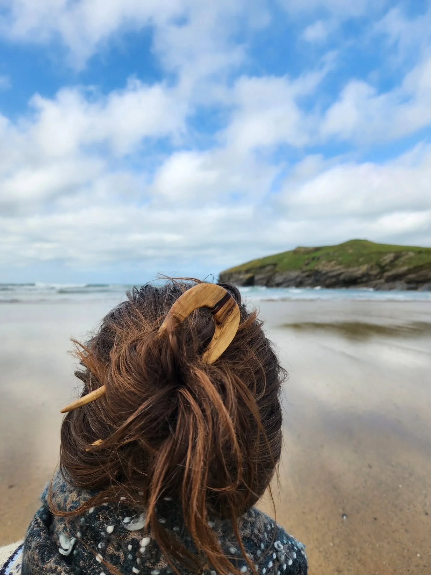 Close-up of two twisted wooden hair sticks with a smooth finish on a light gray surface.